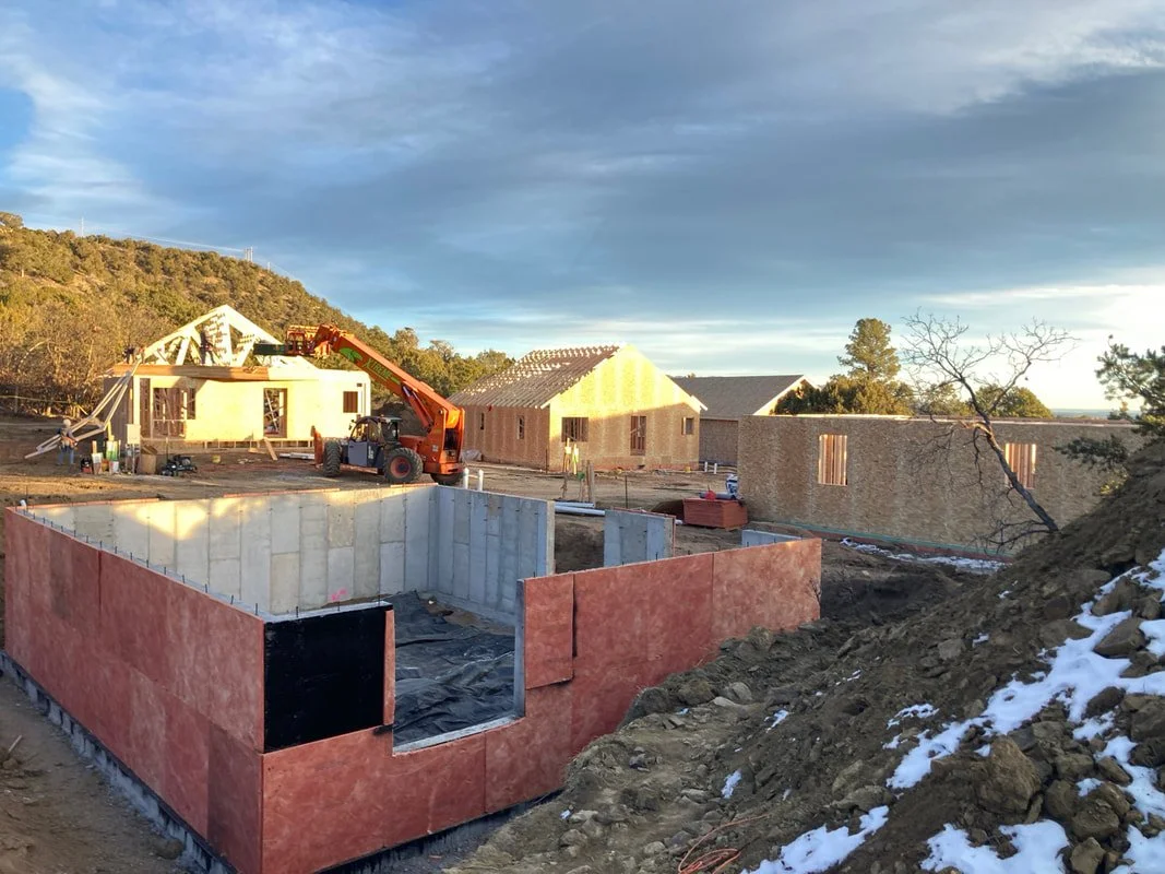 The basement walls of one of our Ponderosa homes are shown here with orange insulative drainboard, an example of our commitment to high-quality construction. Homeowners will never actually see this hidden layer, but it’s part of what makes these homes exceptional at their core – built to be highly durable and super energy efficient. This drainboard helps keep basements warm and dry. Full-height ceilings, oversized windows, and expanded window wells make the basement level feel open and spacious while inviting in an abundance of Colorado sunshine. In the background, you can see three Juniper homes and a carport building as Heartwood's Phase 2 cluster takes shape.