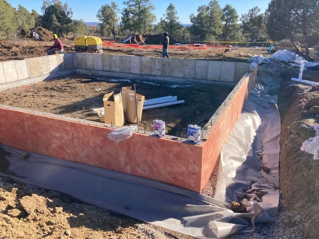 First, the exterior of the concrete is sealed with a waterproofing membrane, which is standard practice. We upgraded this protection with an additional, insulated drainage board that helps keep the basement warm and captures any moisture that makes its way to the foundation wall, giving it a path to drain away. That drainage is captured in a french drain that surrounds the entire foundation and carries water away to drain into an arroyo or drainage ditch. Lastly, a waterproof membrane skirting extends 5 feet out all around the foundation at ground level to shed rain and snow melt away from the house before it can begin to seep down towards the foundation.