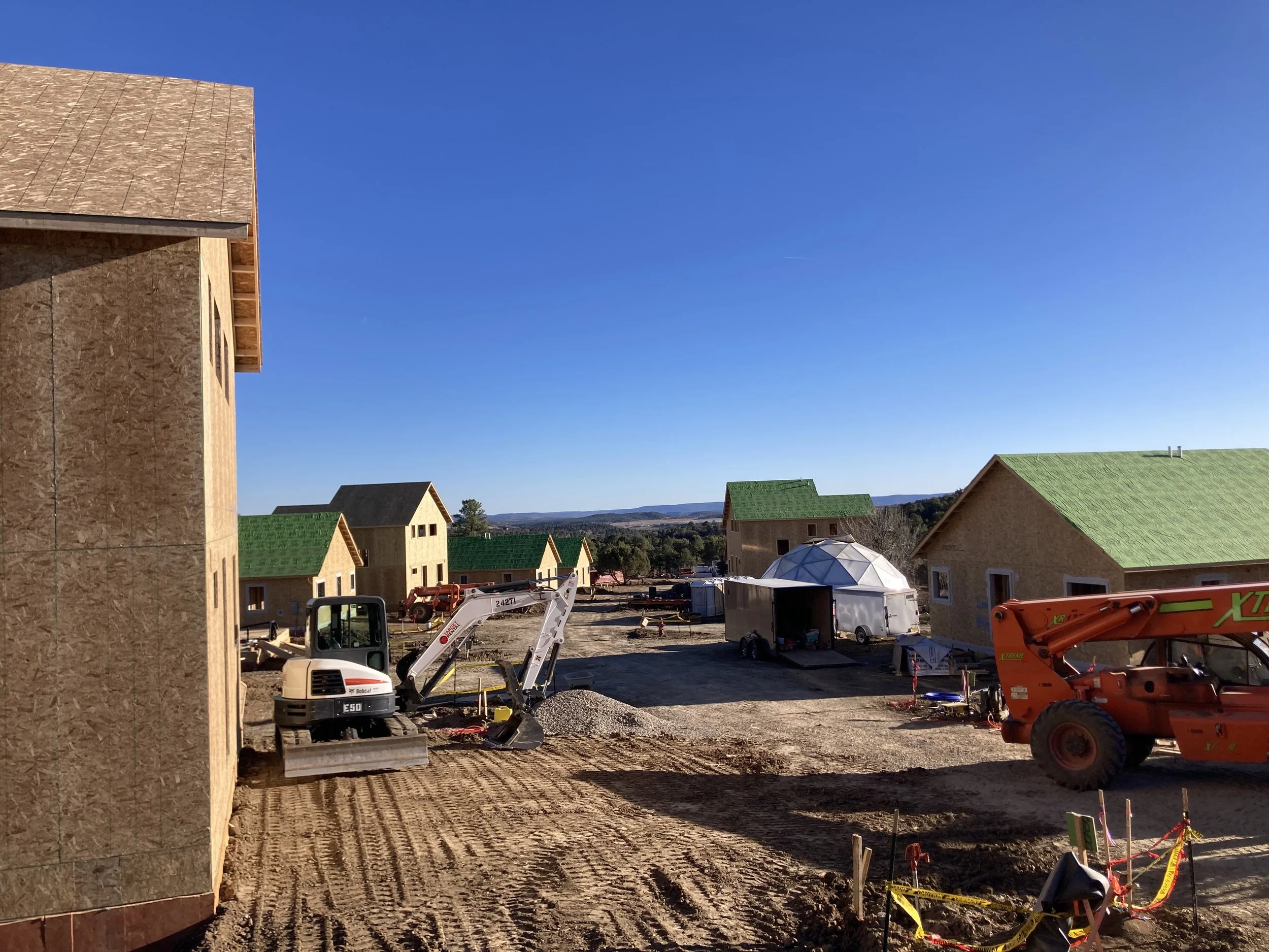 New Phase 2 homes with (temporary) green roofs are popping up. The geodesic dome greenhouse is in the center of Phase 2. Phase 1 is in the background and the tennis, pickleball, and basketball court is on the right.