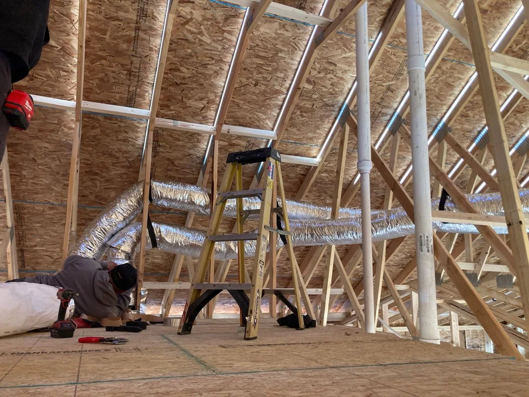 Ductwork being installed for our state-of-the-art heating and cooling systems. All of the Phase 2 homes will be net zero ready, meaning that they utilize a holistic approach that minimizes energy consumption and maximizes comfort.