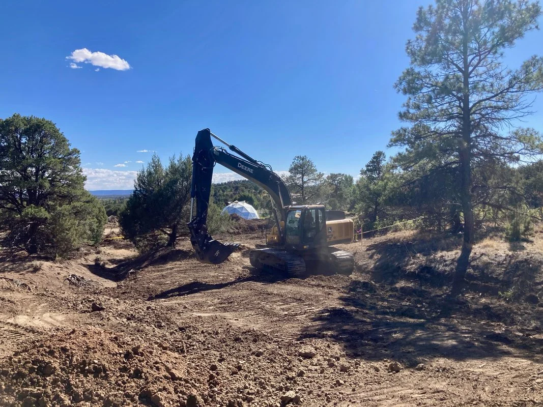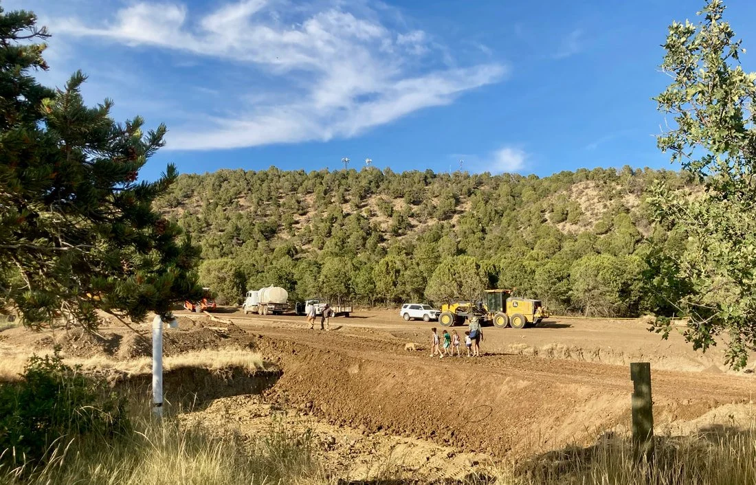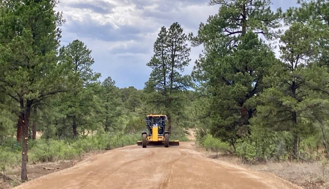 A road grader builds a new emergency access road through our Ponderosa pine forest. Preparing for possible forest fires is a top priority in our Phase 2 development.